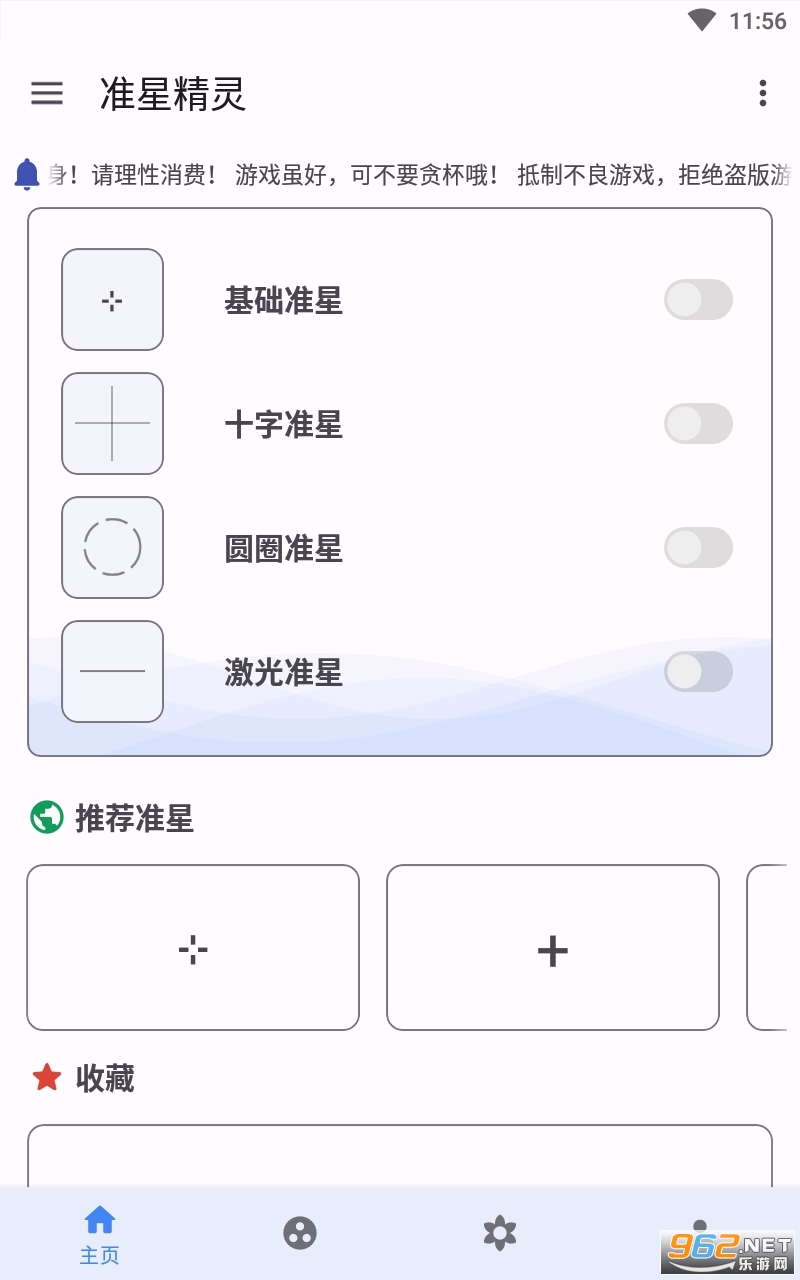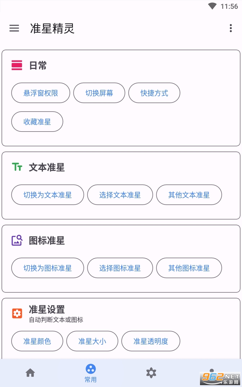 2,基础准星支持颜色、透明度、大小、角度等diy设置,适配安卓shortcut,在支持shortcut的桌面上长按软件可快速开启准星。