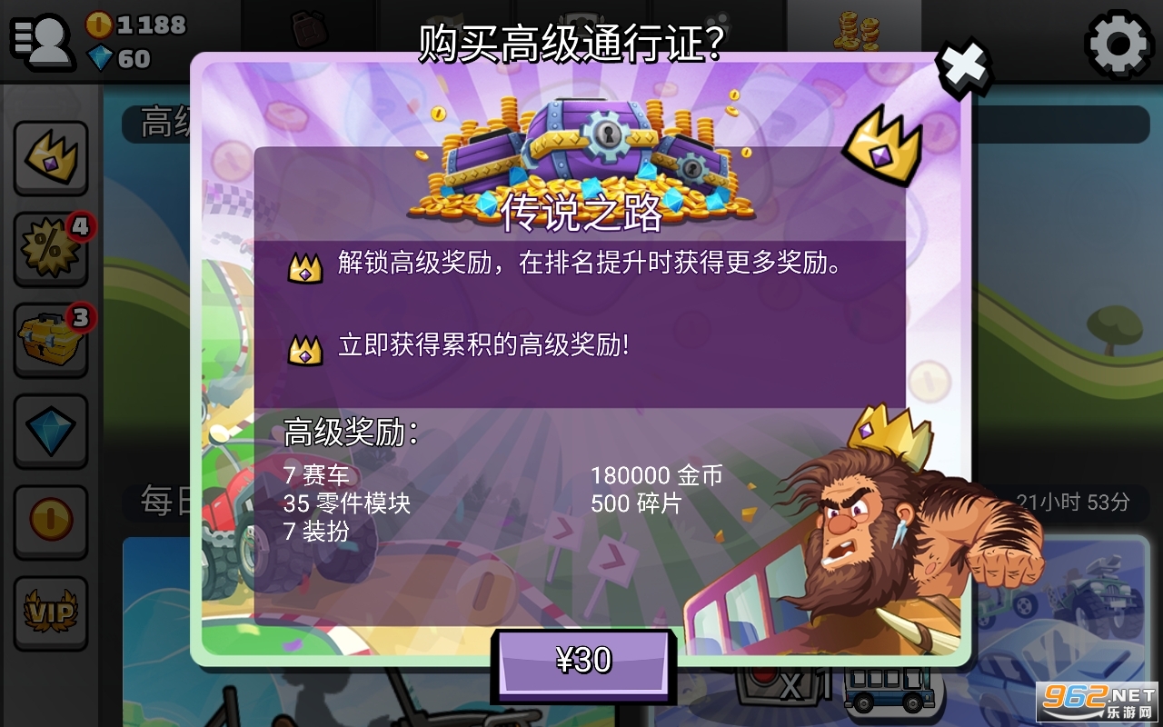1、自定义您的车辆,升级你的车辆的发动机,轮胎,悬挂,防滚架。