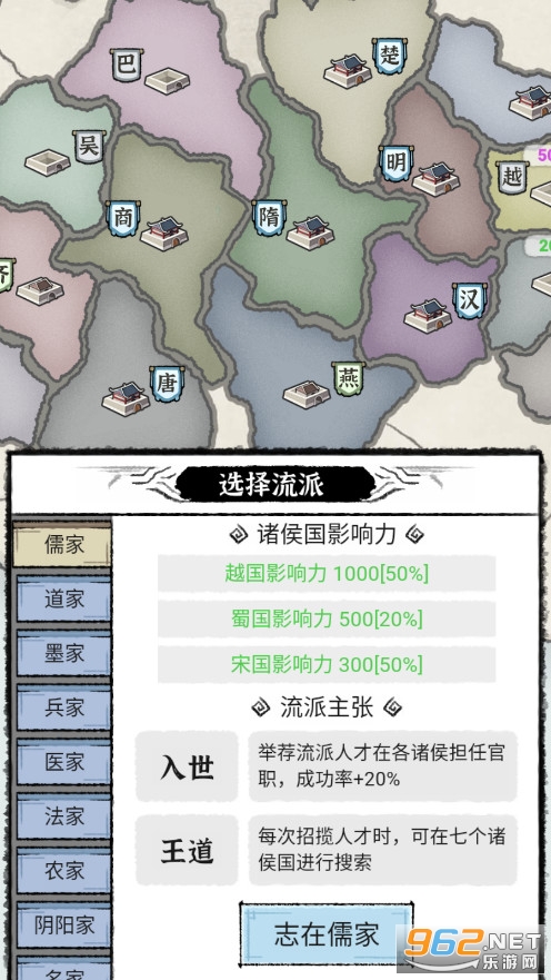 1. 选择流派 — 百家学派各有专长,对各方势力的影响程度也皆不同,你可以自由选择喜欢的流派开始管理,主张自己独特的信念。