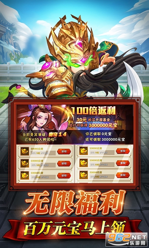 ★日常、签到奖励大幅度提升,在线60分钟即送3W元宝,超强基金百倍返利,总计300W元宝;