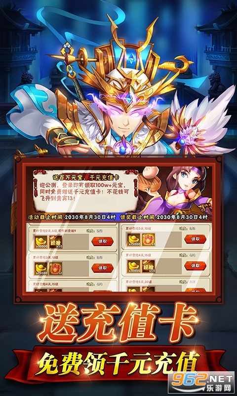 ★创角即送千元充值卡、VIP8、一百连抽、36888元宝,每日签到再送千元充值卡,总计2000充值卡直接免费送!