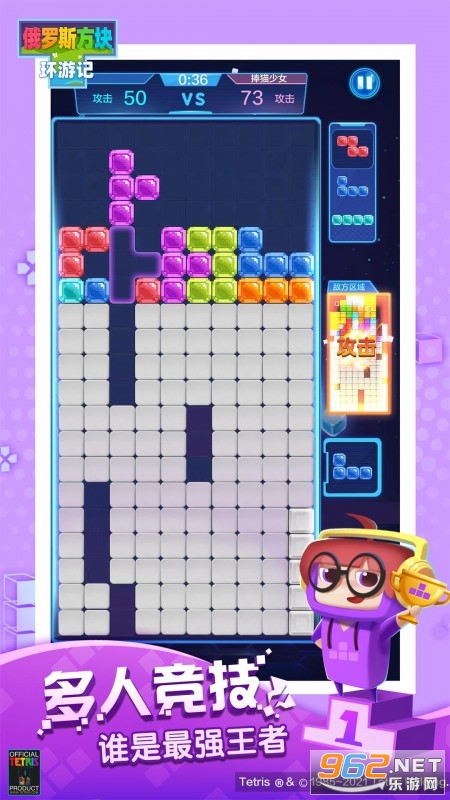 在竞技场上,用俄罗斯方块与其他玩家进行最刺激的对决吧!经典对战场里,实力即是一切!而道具场内,你更要考虑如何用道具去干扰对方。