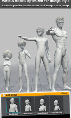 常规虚拟人体app的8头身比例模特在漫画、游戏、插画等领域并不常用。Easy Poser 提供了实用性更强的6头身(多种体型)男、女人体模特。[3头身Q版人体模特准备中。]