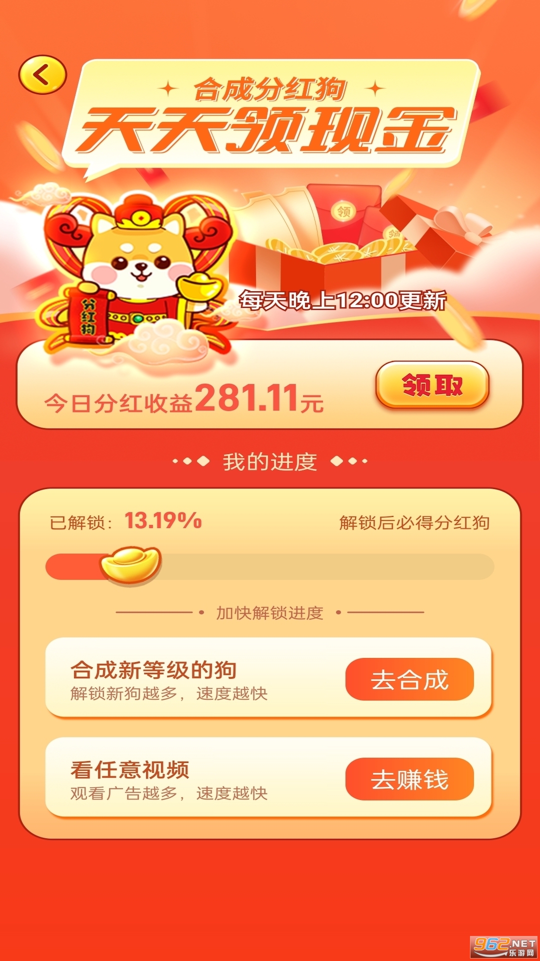 不用耽误太多时间的可爱狗狗合成游戏。游戏采用的是合成分红的玩法,合成赚钱,秒提现秒到账.通过养成各个狗狗可以获得丰厚的收益,两只相同的狗狗即可合成。高等级的狗狗收益更高!