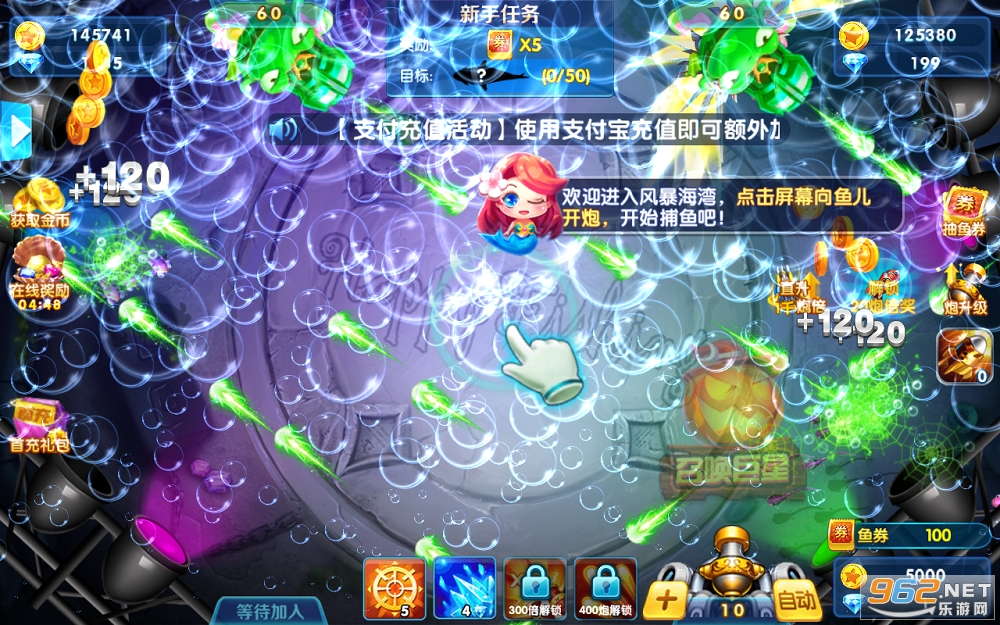 2、金币不多时,建议多捕获小鱼,慢慢积累金币,等到积累一定程度之后,一般鱼群也刚刚好出现,这个时候一定要把握好时机,将鱼群收入囊中,使自己的财富更进一步,然后把目标对准BOSS,一步一步往高处走。