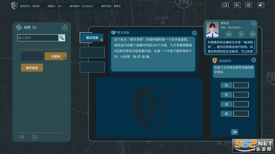 系统中的案件都是炽城真实发生过的并且是以关键线索的形式进行存储的,每个线索都包含了关于线索的信息,你需要通过查看信息不断地找到新的线索,把碎片化的线索内容在脑海里拼凑出完成的案件并推理出案件的发生经过,只要回答对了系统中有关案件的问题就算是破解了一个案件,破解案件后可以查看罪犯的“犯罪陈述”。