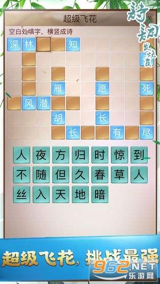 2、超级飞花,这是一款非常有难度的猜成语模式玩家需要把文字合理的运用让文字横竖都变成为成语。