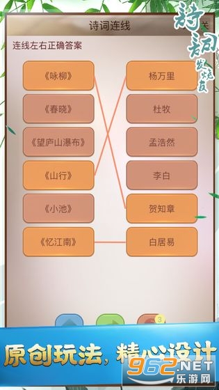 2、诗词连线,玩家在这个模式下根据诗名来连接正确的作者。