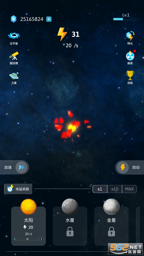 从宇宙大爆炸开始,然后点击以创建自己的宇宙。在Idle Galaxy中,你将建造太阳,水星,金星,地球,火星,木星等,进而拥有整个太阳系甚至整个宇宙。