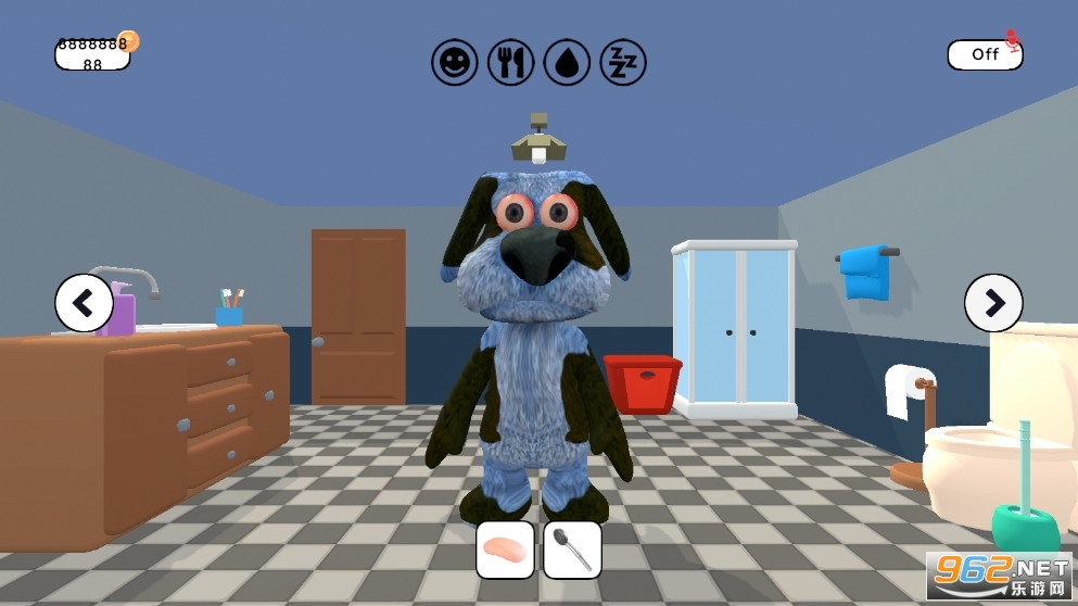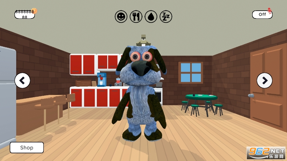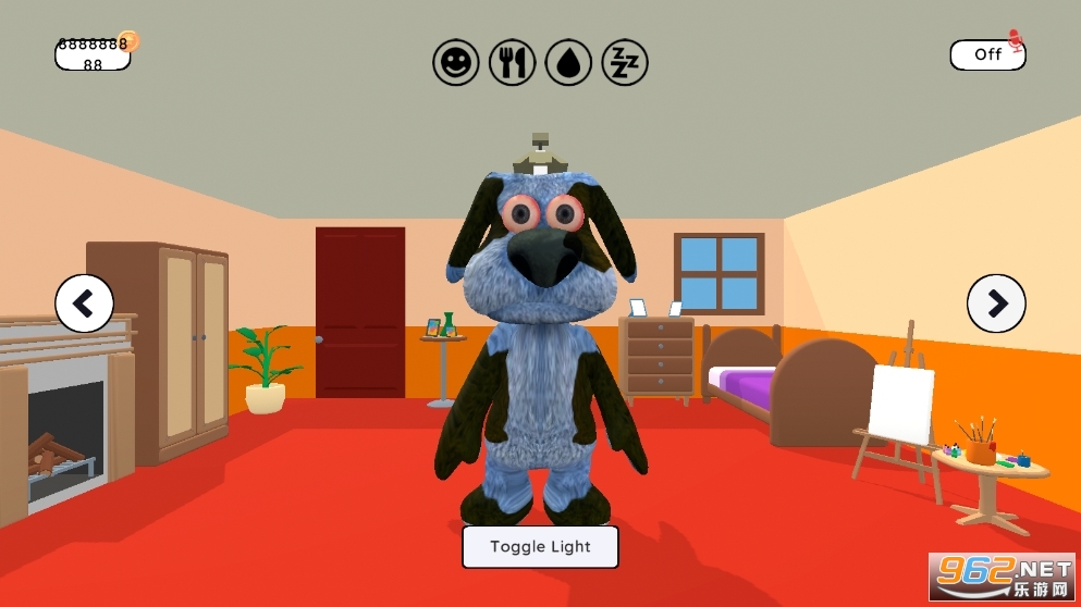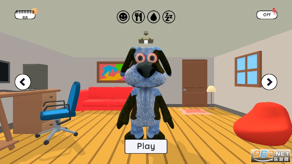 1、和巴勃罗互动,通过它的心情给它不同的物品,它会在场景中自由行动,陪伴你一起玩耍。