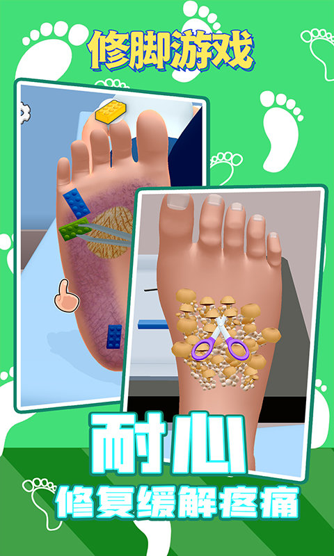 这是款画风魔性的休闲游戏,在游戏中,玩家将成为修脚大师,帮助客户修脚,治疗各种脚步问题,令人兴奋的游戏内容,丰富的游戏玩法以及许多修脚工具等着您来解锁!