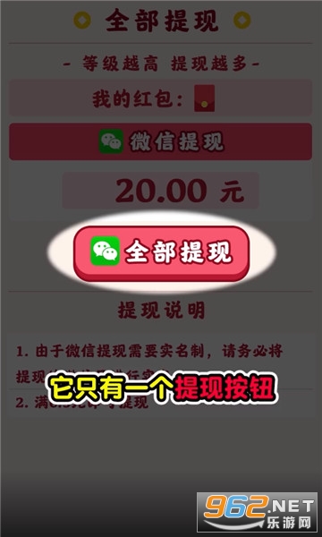 在游戏设置里的“用户协议”就可以看到各个金额的完整提现条件,想提出300需要完成三个阶段条件,分别是1、红包满足300;2、累计登陆2天、每天过80关;3、等级达到30级。