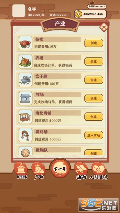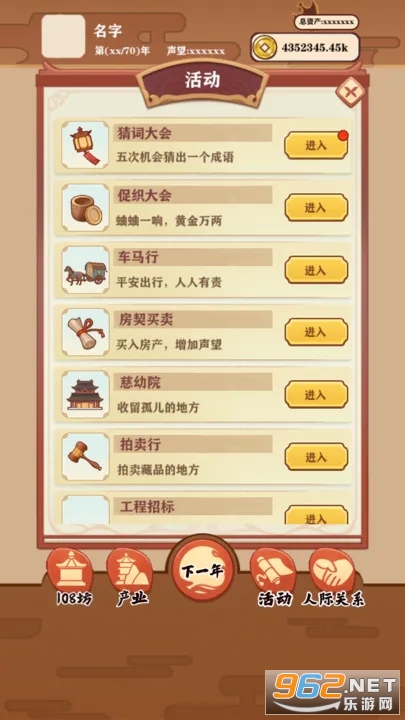 你还可以参加猜词大会,参加促织比赛,买卖田契/房契;以及参加工程招标,进入拍卖行买入天下奇宝,经营矿场,创建军营,征战天下!