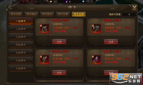 神卡不仅对应着相应的上古异兽,而且还有品级、品质的区别。3张相同的神卡还可以进一步融合成为更高品质的卡,但小心有一定失败率,会使卡牌回收成为卡灵值。当然,这个卡灵值也有它的作用,可以用来兑换完美品质的神卡。