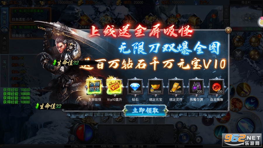★【开局福利】:开局无限刀,神装光柱满地爆,在线送648充值卡,群体施毒术!还有每月签到送最高1亿钻石!