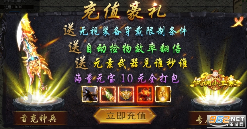 【烈火一刀】上线送满级VIP、星耀特权、神赵云体验时装*1、限定称号*1、元宝*50万。送满级切割,刀刀切割,刀刀高爆不是梦。送青莲地心火,全新异火系统,异火加成逆天伤害。爆率超高,小怪爆终极,传说BOSS必爆大米,充值全靠爆!点券地图必爆点券道具,可以兑换首充和自动回收。