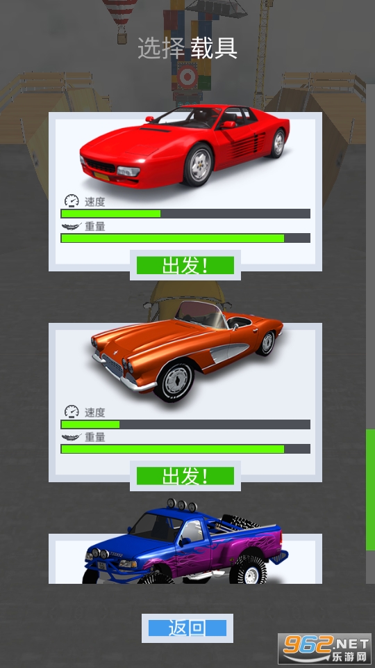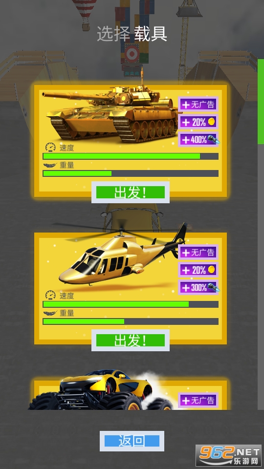 非常爽快刺激的一款赛车闯关竞技类的休闲游戏,玩家在游戏中可以选择各种不同的载具,除了车辆之外坦克飞机都可以选,感受肾上腺素飙升的快感吧!