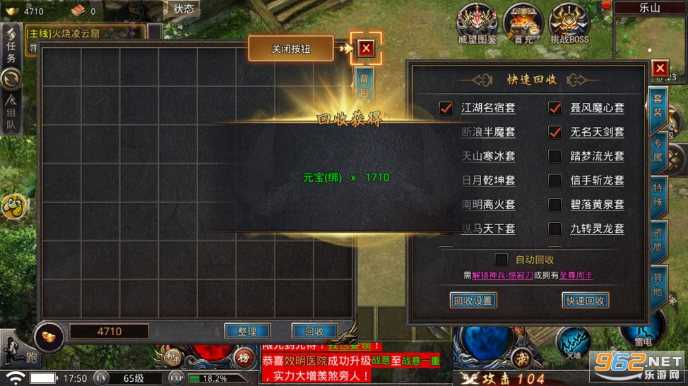 【3】升级过程中别忘了打开背包使用赠送的新手药品,足够支撑到28级以后,打怪获得多余装备不要扔掉了,自动挂机10分钟系统自动回收,当然手动到npc回收装备价格更高。