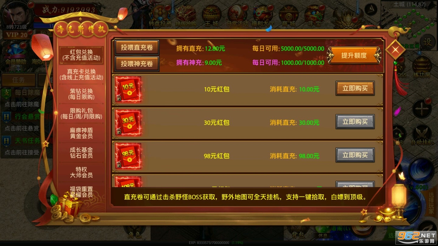 ★后缀说明:内置海克斯特权,可通过打怪爆直充券,活动获取神充券兑换特权额度,通过海克斯飞升特权,可兑换红包,真充卡,紫钻,限购礼包,麻痹神盾,成长基金等游戏内特权