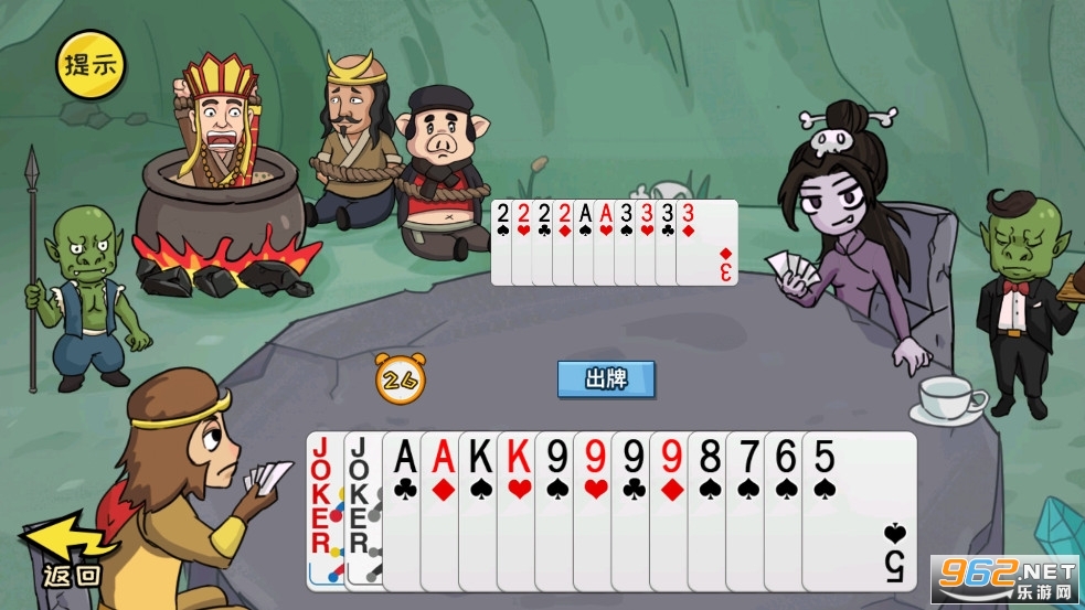 首先出任意牌,比如456789骗白骨精出4个3,然后将其中一个3拖动给孙悟空,孙悟空会变身卡牌大师,飞出纸牌3去打赢白骨精。