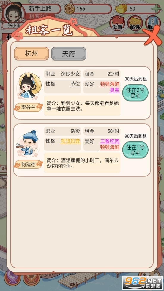 《古代收租日记破解版》是一款画面清新的Q版古风的模拟经营手游,游戏中玩家将在杭州去经营自己的酒店,可以建造升级房屋,为租房的房客提供优质的服务,可以招募各种服务员来为顾客进行服务,可以发布招募广告招募众多的人来住店,赚取金钱。