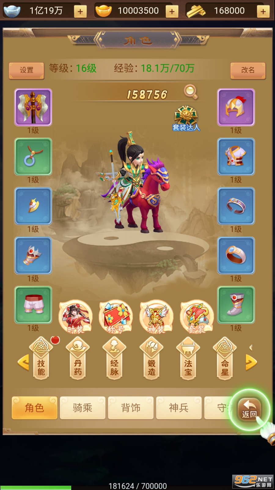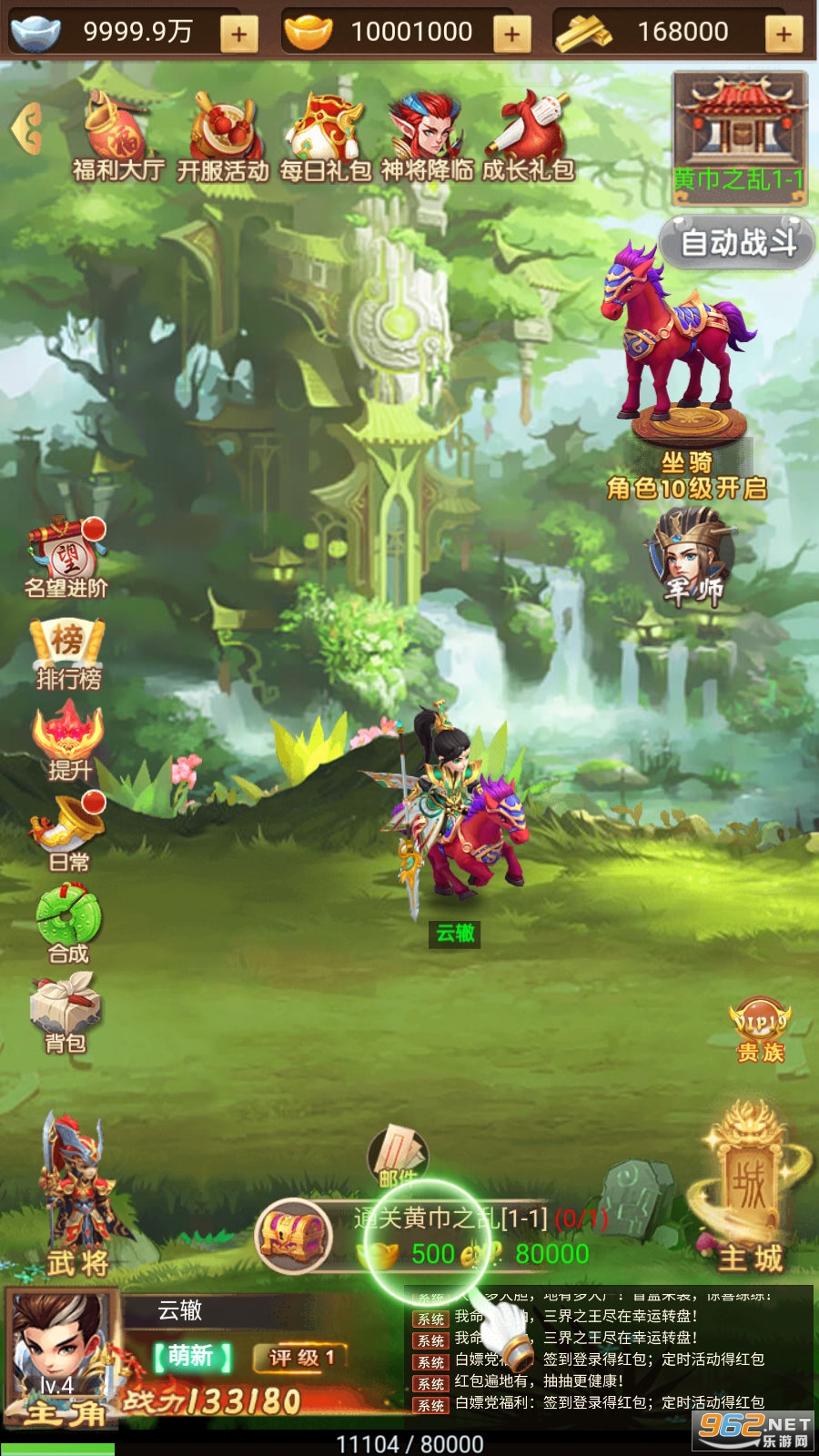 ★上线福利:VIP19、sssssr卡包*1、1000万元宝、168000金条、1亿银两