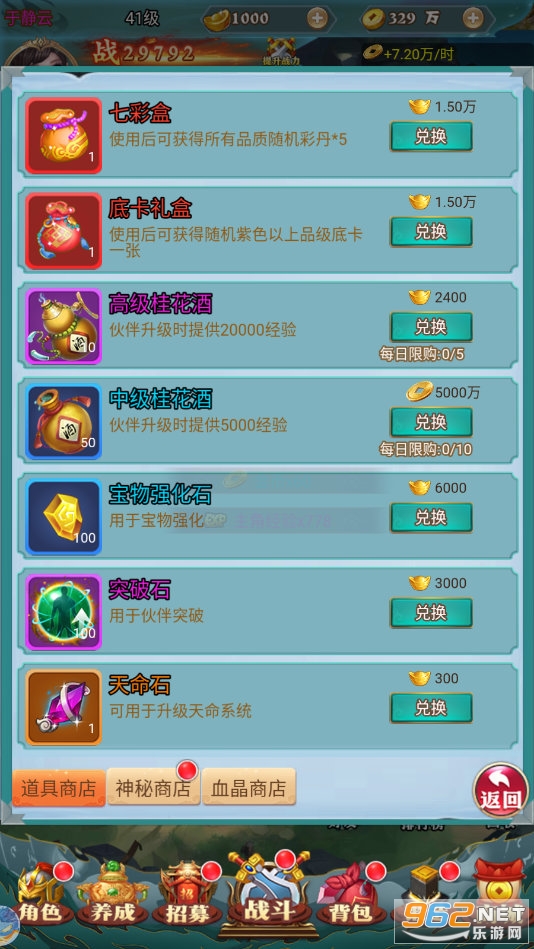 招贤币*1000、初级法宝粮食*20、 突破石*100