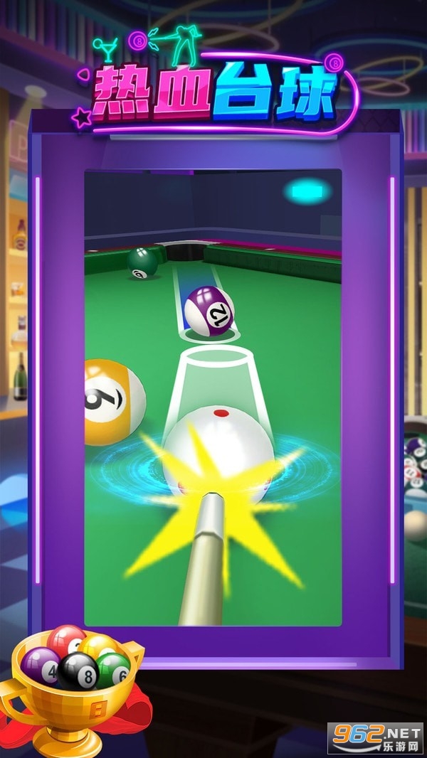 《热血台球》是一款台球竞技游戏,画面鲜艳靓丽,仿照真实的台球规则,感受台球带来的乐趣,自由调控打击台球的角度和力度,开始全新的台球游戏吧。