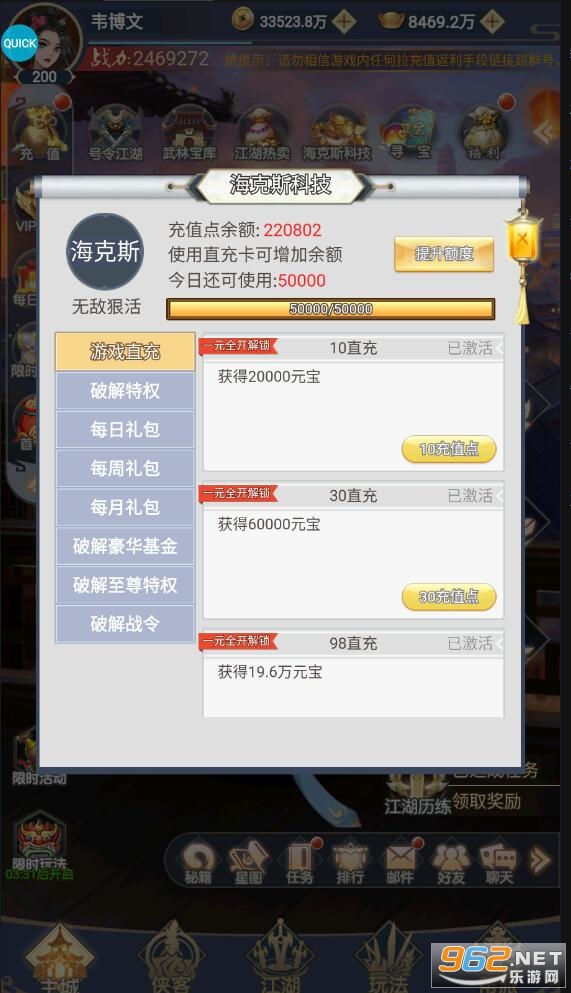★后缀说明:1元解锁海克斯科技特权,通过科技特权,可进行游戏直充,直充获得对应金额的元宝和vip经验