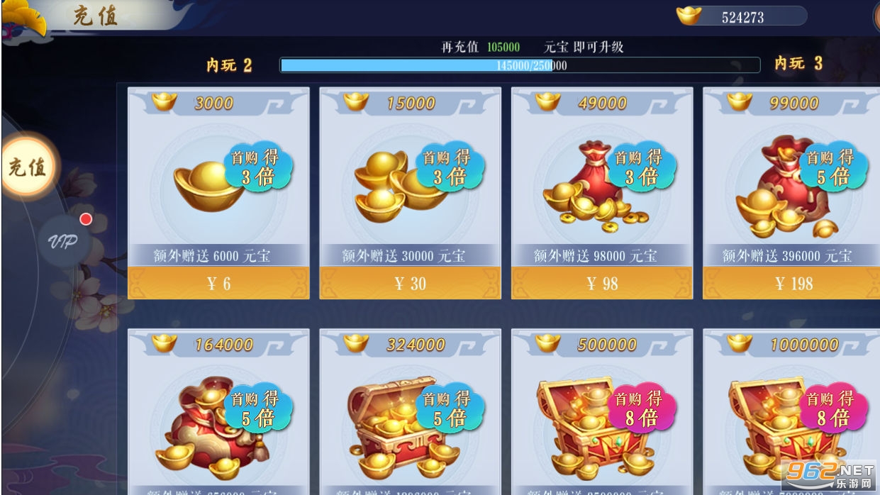 至尊礼包:5级宝石礼包*2、符纹寻宝券*30、灵器寻宝券*30 GM500