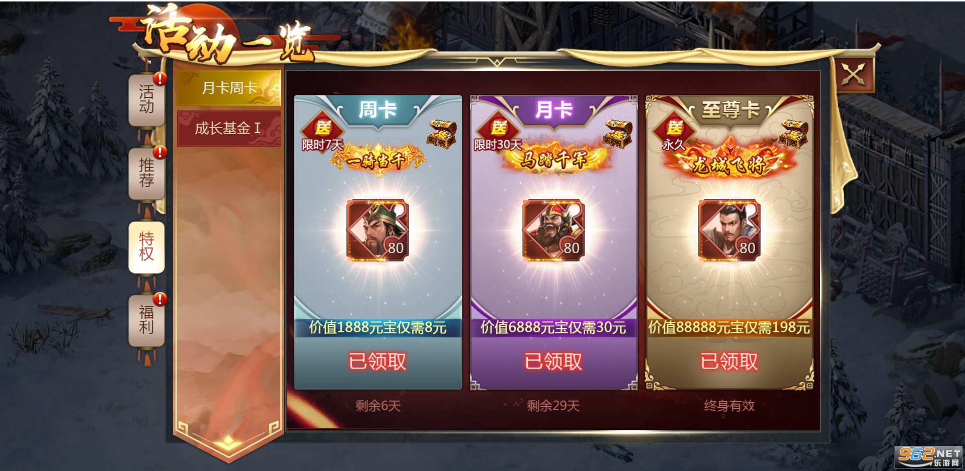 ★超值周卡月卡福利拉满,送神将关羽张飞刘备等超强战魂一统三国