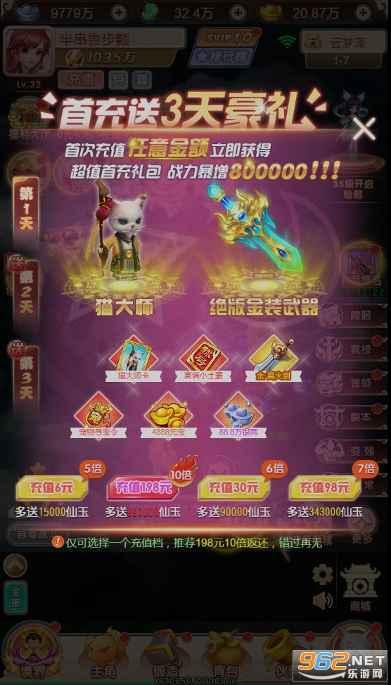 内容:元宝1W、银两*500W、精灵属性丹*10
