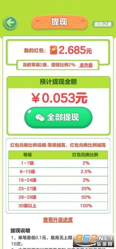 青青草原红包支持全部提现,不过有一个等级比例,例如等级再1-7级的时候可兑换红包比例为2%,在25级到27级提现比例是20%,30级以上奖励兑换比例提升到100%。单笔提现红包最低0.1元,最高无上限,每日最多可提现10次。