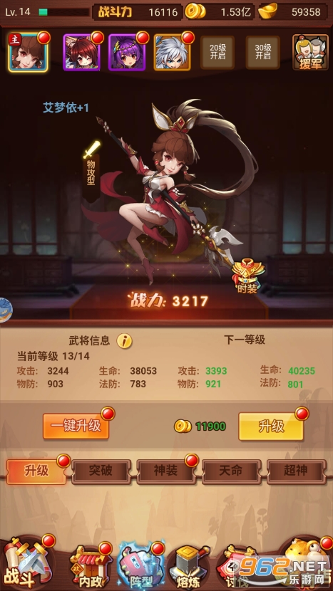 4、游戏打破固有的三国名将设定,颠覆传统的人物形象设定,以独特的手法还原了每个三国名将的特色,此外配合多样的将领养成系统,武将升级、进阶、升星、天赋、神器,即使是无名将士经过精心培养,也能媲美吕布三英