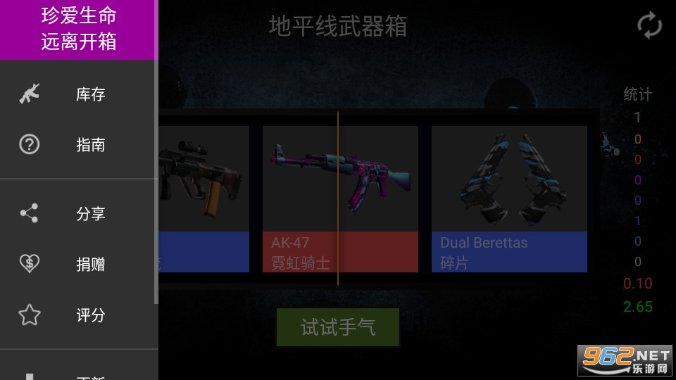 模拟开箱几率和皮肤价值将与真实CS游戏基本维持一致,是时候证明自己是非酋还是欧皇!