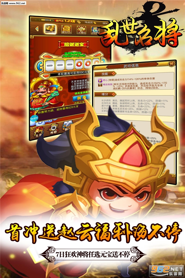 《乱世名将福利版》是一款非常好玩的策略回合卡牌对战游戏,这款游戏玩家可以招募到强力的武将进行冒险,组建不同的队伍,自由度非常高,根据自己的喜好来培养他们,为他们装备神器,提升技能,还需要进行合理的羁绊搭配才能更强强力,感兴趣欢迎下载体验!