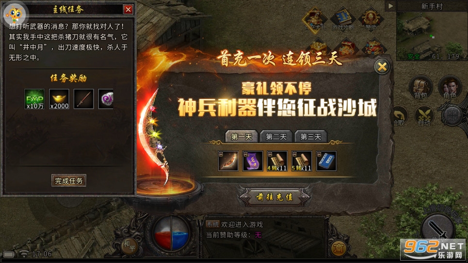 所有新手进入游戏,都会在闭关修炼地图,建议出生后这里泡3分钟到52级再去打宝,可以免费领到雷霆级衣甲和一把屠龙级武器