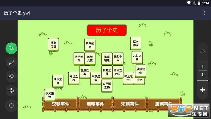 历了个史是一款历史知识互动消除课件游戏,它有4个主要的事件设计:汉朝事件、商朝事件、宋朝事件、唐朝事件,将不同的方块中的历史事件点击拖动到对应的区域即可消除!