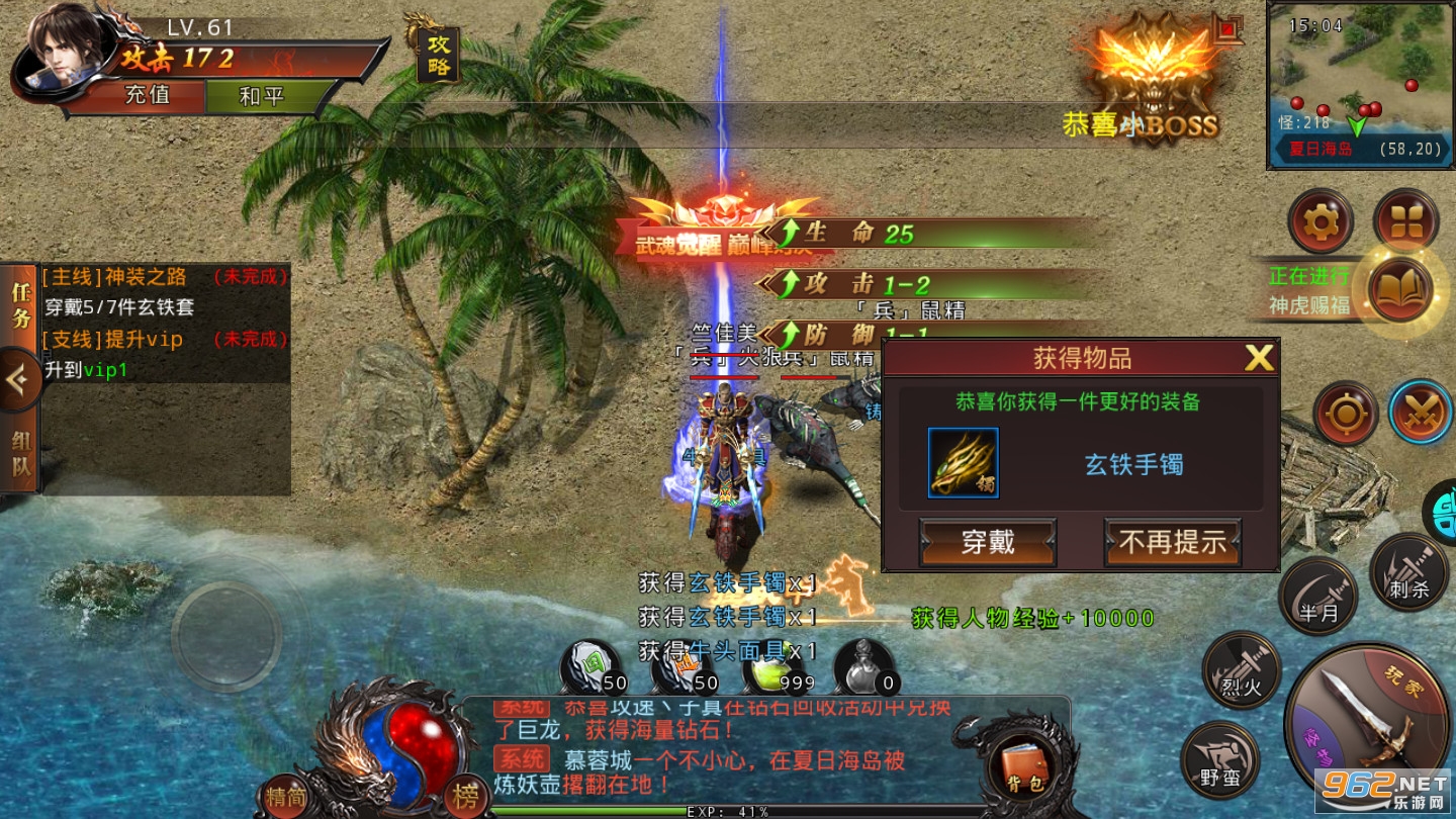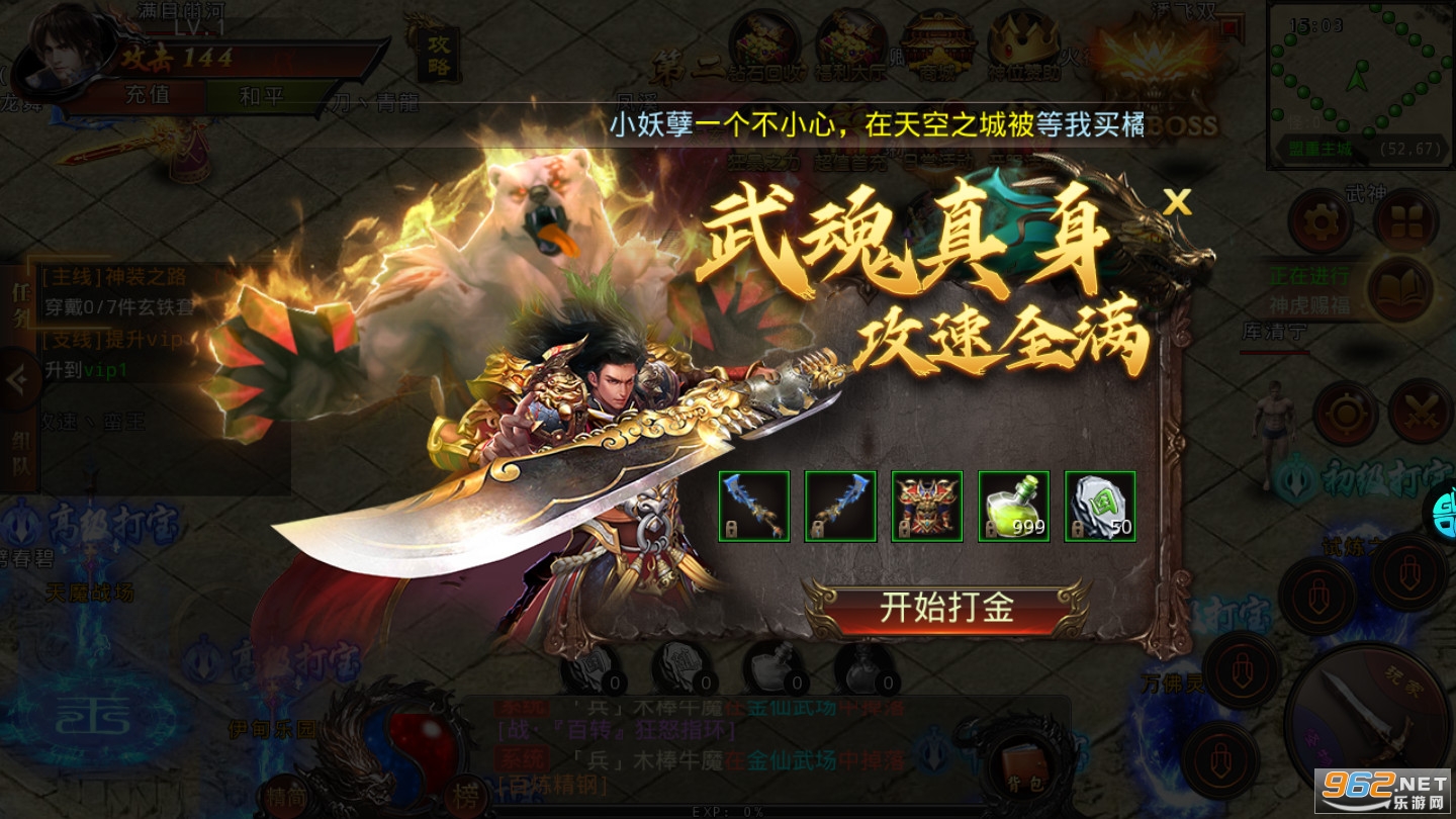 上线送新秀套装,999金疮药,独创双手武器上线就满级攻速,拒绝付费攻速和蜗牛打怪,真.一秒十刀。地图无限制,完成任务送满级vip,送麻痹特戒,复活特戒。更有全新异火,武魂,魂器,魂环,升级激活武魂真身,带你体验前所未有的传奇时代