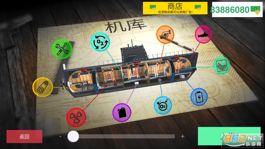 游戏中有10种类型的潜艇升级,每种类型都有6个选项-明智地选择策略!核还是柴油?下次您要为您的战舰选择哪种引擎?