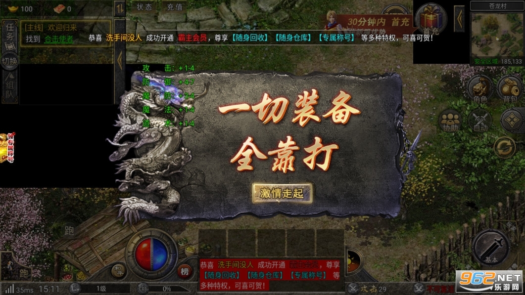 首冲赠送3转武器,装备宝箱,贵族特权卡,限量版称号,直升丹等,装备无忧,绝对超值。