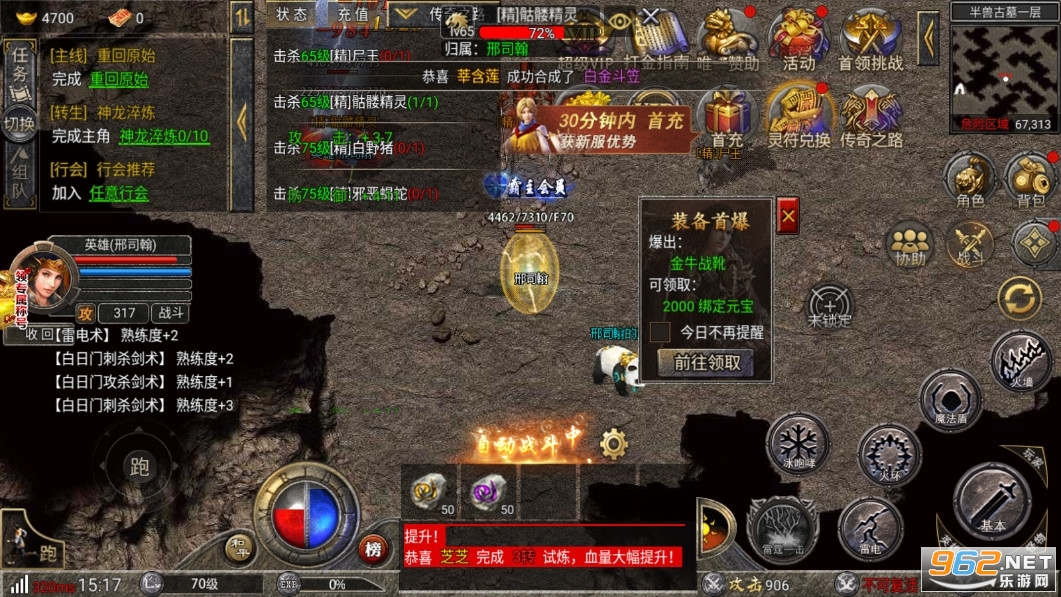 挂机轻松升级,掉落的装备和材料也会自动拾取