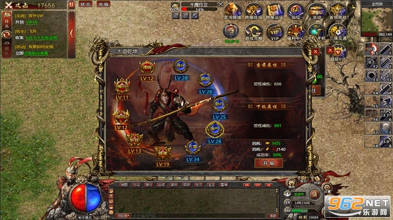 共有10个小系统组成,左侧为高级属性,右侧为初级属性,升级材料可通过打怪、击杀BOSS和回收高级装备获得。