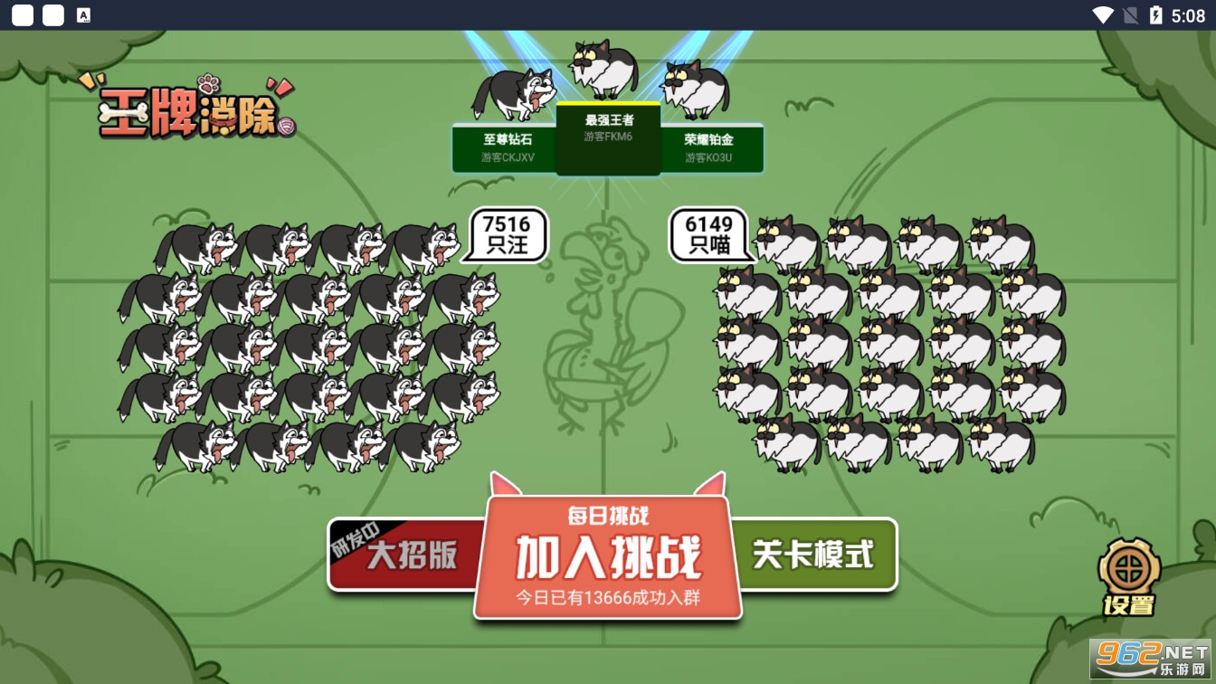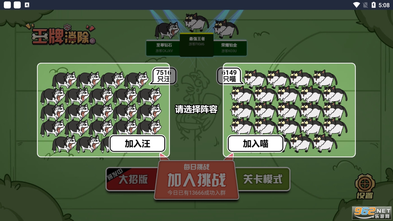 《喵牌吃鸡》是最近爆火的羊了个羊同类型游戏,游戏中采用了全新的方式,你可以自己加入猫队或者狗队来进行通关,为你所在的队伍添砖加瓦,游戏的玩法简单,三个相同的方块就可以消除,还有着有趣的关卡,快来试试吧!