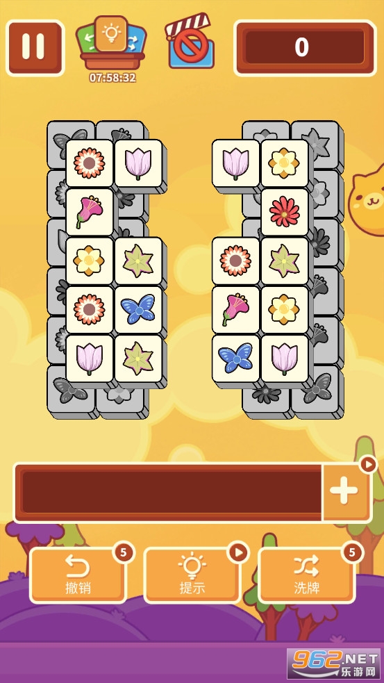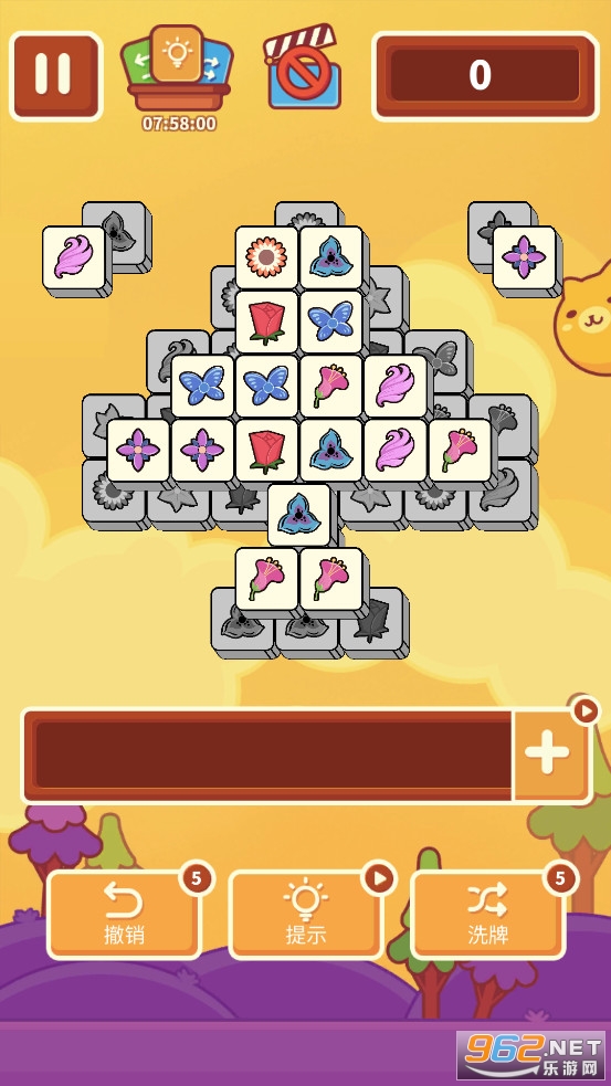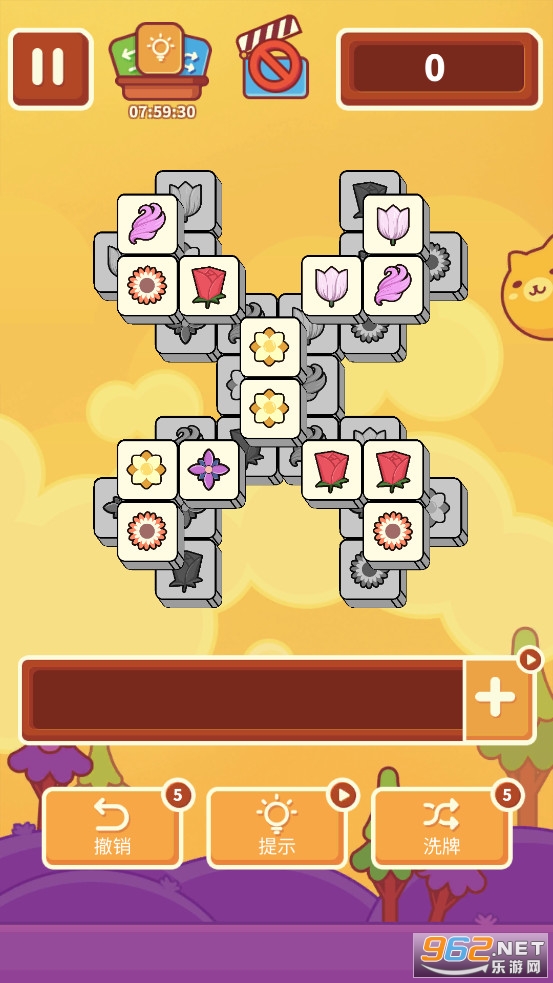 趣味的消除游戏,采用的三消玩法,从上方选择花朵会收集到下方的方框中,三个相同花朵连接可以消除,注意方框的长度有限,合理的选择花朵,如果方框集满就失败了。