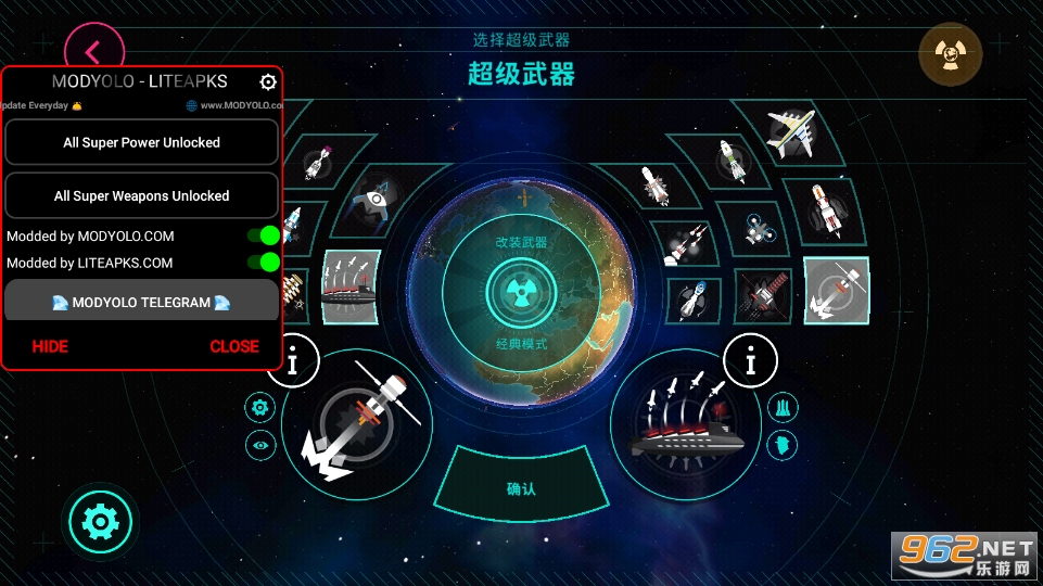 5、当玩家选择好核势力之后,则会进入选择超级武器的界面。超级武器可以选择两种,但在游戏中只能选择一种超级武器。超武各有各的特点,大部分是攻击性的,但也有防御性的武器,比如铁穹防空系统。选好超级武器,点击开始,核战一触即发。