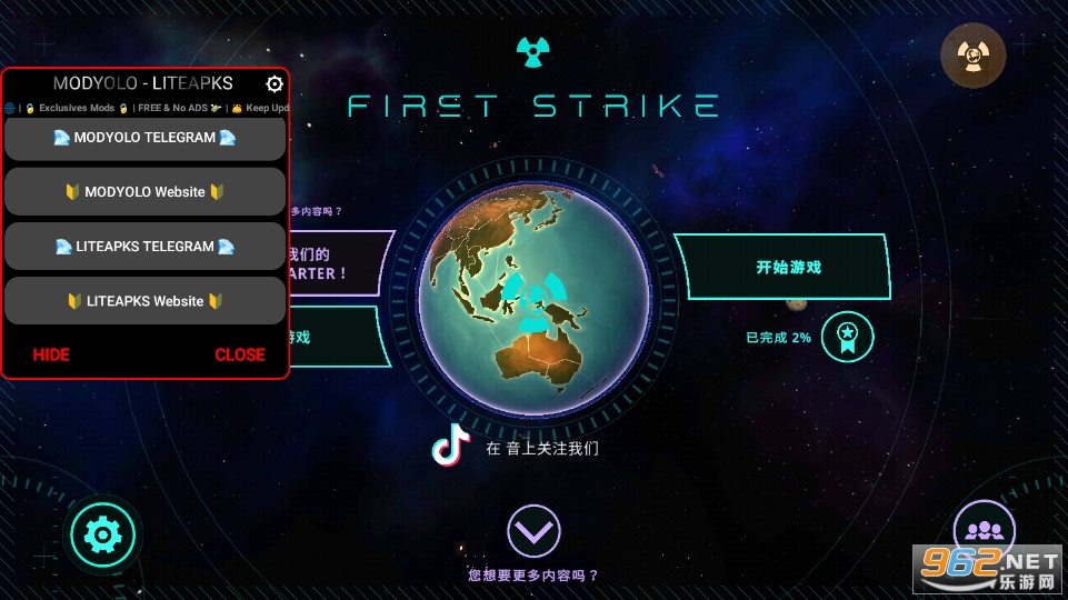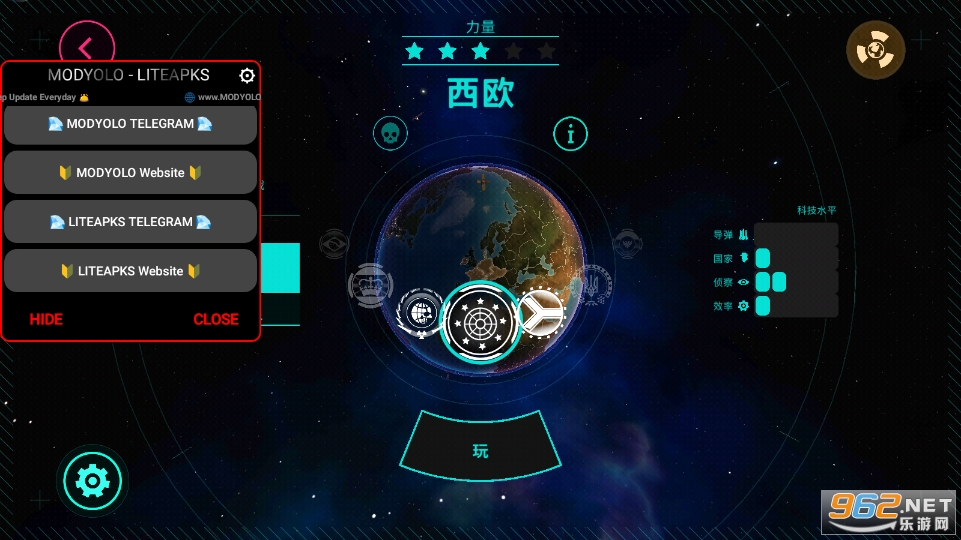3、点击开始游戏,首先进入的是选择你的核势力,每个核势力初始有这不同的科技水平和核弹储量,右下角则是初始难度,初始势力越弱,难度越高。开始只有三个核势力,以及一个特殊核势力(通过填写姓名和邮箱来解锁)。出特殊国家外,玩家可以通过在战争完成所选核势力的专属目标来解锁其他核势力,专属目标比较简单,不会让人感觉仰天长啸“oh my god”这种地步。当然,hc模式就不一定了。