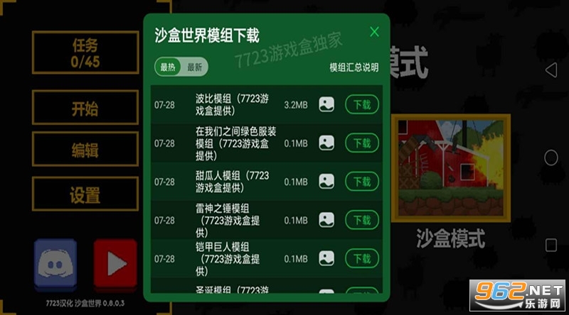 《沙盒世界7723自带模组》是一款高度自由的模拟游戏,玩法类似《甜瓜游乐场》、《火柴人沙盒模拟器》这一系列的游戏,里面拥有多个地图,丰富的武器,道具等等,玩家可以自由的选择场景,拖拽物品,人物等等,打造出理想中的场景和画面,在这里制造剧情,模拟任何你想要模拟的事情!
