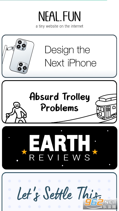 《neal.fun》是一款趣味在线游戏合集app,互联网的一个小网站,拥有rocks,lets settle this,design the next ipone,life stats等非常多的小游戏可以让大家随时随免安装直接玩,轻松打发时间,操作方便简单!不知道玩什么游戏的话就下载nealfun吧!