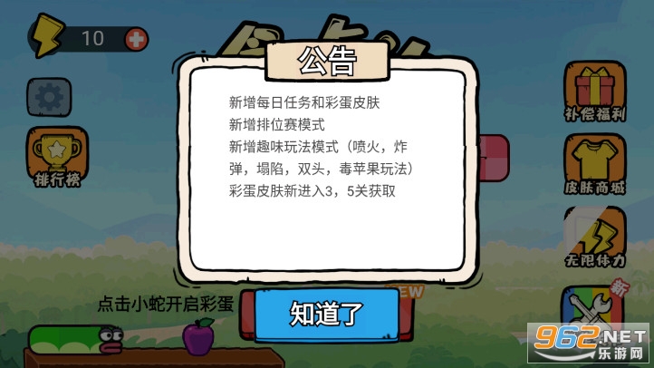 新增趣味玩法模式(喷火,炸弹,塌陷,双头,毒苹果玩法)彩蛋皮肤新进入3,5关获取